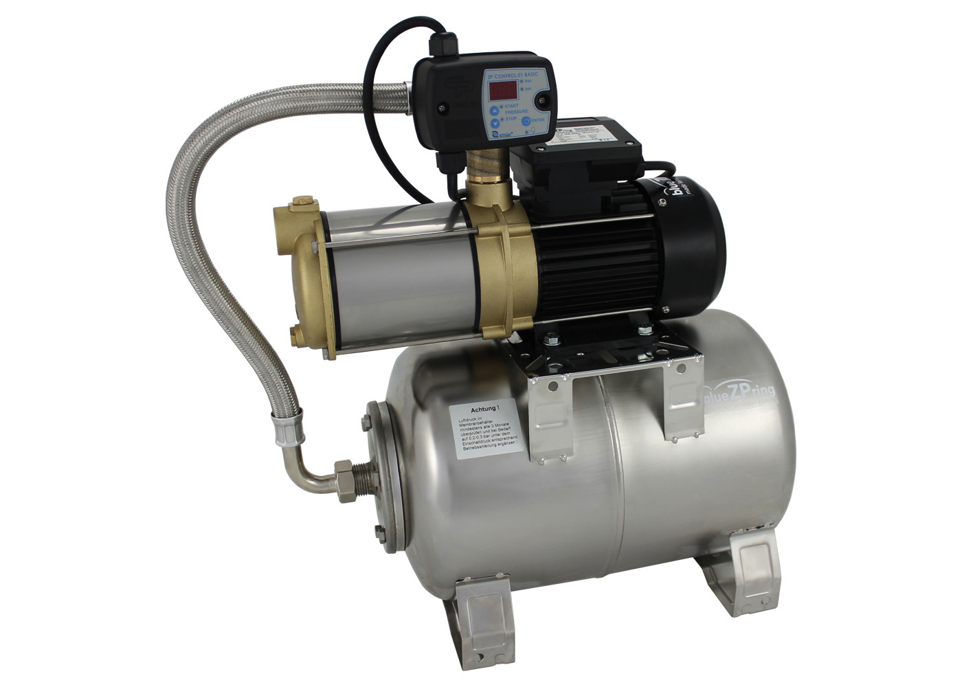 Membrandruckbehälter aus Edelstahl, digitaler Druckschalter für Automatikbetrieb, digital einstellbarer Ein- und Ausschaltdruck, integrierter Trockenlaufschutz (Pumpe wird bei Wassermangel automatisch gestoppt und Funktionsstörung wird angezeigt, automatischer Re-Start möglich), geringer Druckverlust bei gleichzeitiger Wasserentnahme an vielen Verbrauchern, mehrstufige Kreiselpumpen horizontal, wartungsfrei, Druck- und Saugstutzen 1" Innengewinde (CPS 25-5 Suchstutzen 1 1/4" IG), Saug- und Druckgehäuse aus Alpha-Messing, Leiträder aus Spezial-Noryl, Motorgehäuse aus Leichtmetall L-2521, 20 l Membrandruckbehälter, steckerfertig, mit 2 m Netzkabel H 07 RNF und Stecker, für Regenwassernutzungsanlagen/Beregnung/Druckerhöhung und zur Förderung von klarem Wasser ohne aggressive und abrasive Bestandteile