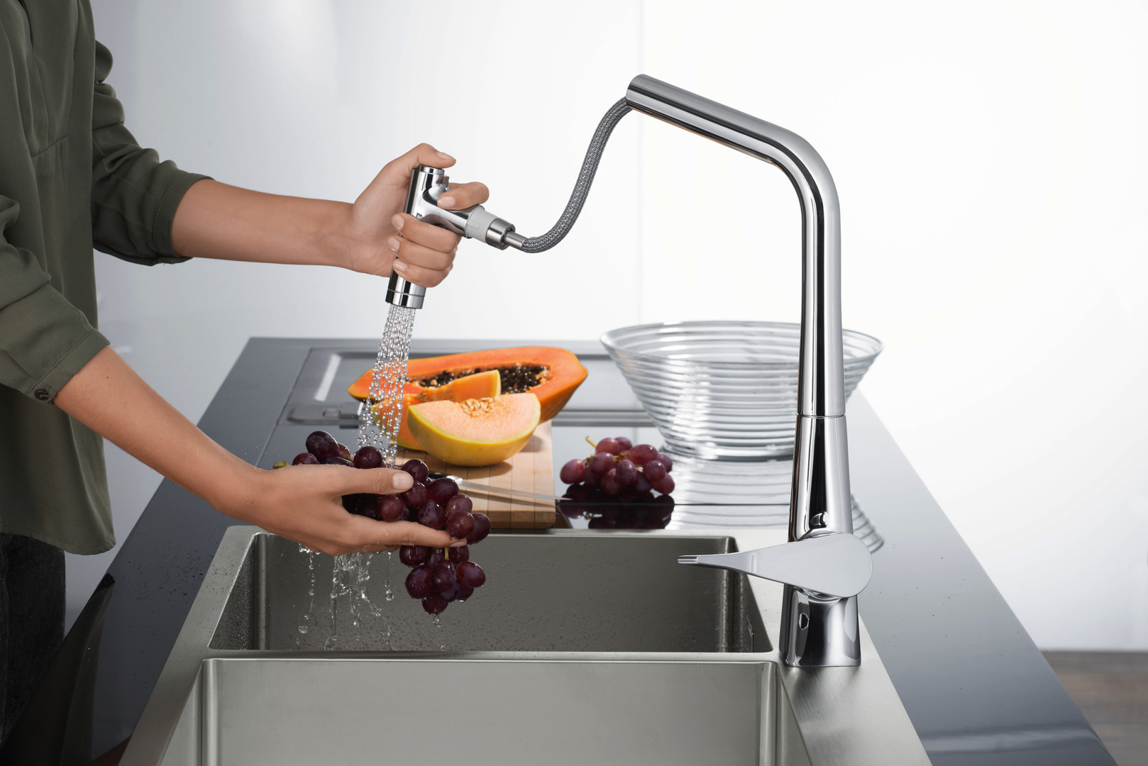 ComfortZone 200, Schwenkbereich einstellbar in 2 Stufen auf 110° oder 150°, flexible Positionierung Bedienelement, 2 Hahnlochbohrungen mit Ø 35 mm erforderlich, Laminarstrahl, Brausestrahl, Auszugslänge bis zu 760 mm, Brausestrahl arretierbar, Strahlrückstellung durch Tastendruck und Strahlrückstellung automatisch durch Schließen der Armatur, Select-Knopf zum An- und Abstellen des Wasserstrahls, MagFit magnetische Brausehalterung, Keramikmischsystem, max. Durchflussmenge bei 3 bar 8 l/min, Rückflussverhinderer integriert, nicht für Durchlauferhitzer geeignet, sBox für geschützte Schlauchführung im Unterschrank, Quick Clean Antikalksystem
