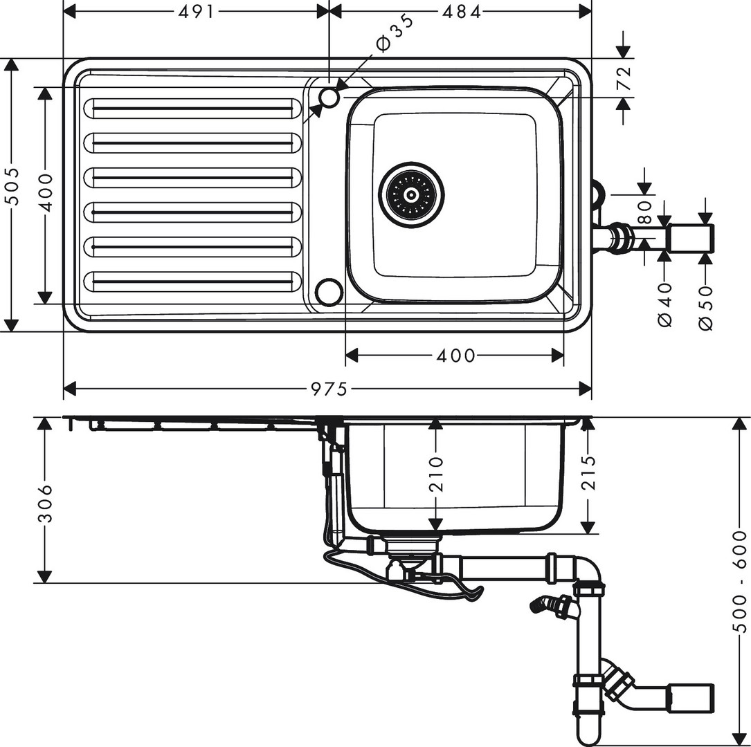 hansgrohe Einbauspüle S4113-F400 400/400 955x485mm, mit Abtropffläche, automatische Ablaufgarnitur, Edelstahl
