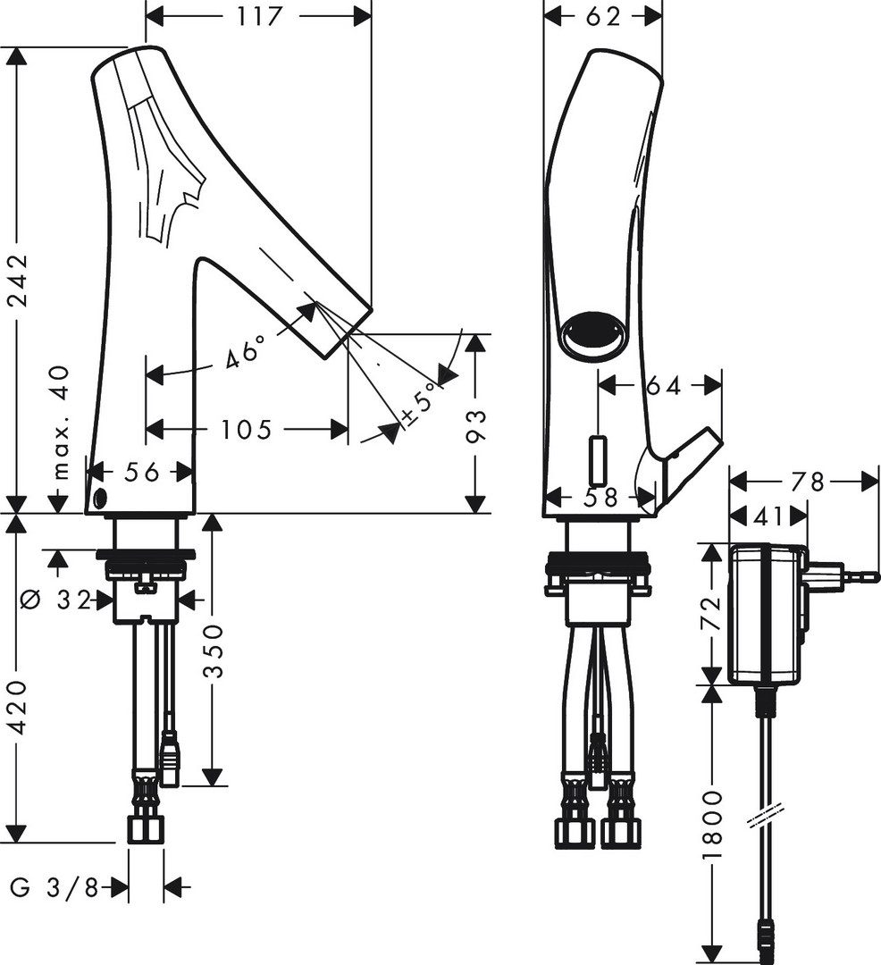 ComfortZone 90, Brausestrahl, max. Durchflussmenge bei 3 bar 3.5 l/min, Temperatur einstellbar über seitlichen Mischhebel, mit isolierter Wasserführung Wasserwege ohne Kontakt zu Nickel und Blei, Infrarot Näherungselektronik, automatische Umgebungsanpassung der Infrarotsensorik, Reichweite der Infrarotsensorik einstellbar (2 Einstellungen), Batteriebetrieb 6 V (Lithium Batterie, Lebensdauer ca. 2 Jahre, Batterie im Lieferumfang enthalten)/Netzanschluss 230 V, Spülzeit 10 s, Hygienespülung aktivierbar (automatischer Wasserlauf), Frequenz Hygienespülung 24 h, Spülzeit Hygienespülung 10 s, Dauerspülung aktivierbar (einmaliger Wasserlauf für 180 Sekunden, geeignet zur thermischen Desinfektion), manueller Wasserstop zur Beckenreinigung, Anschlussart G 3/8 Anschlussschläuche, Anschlussgröße DN15, Schmutzfangsiebe in den Anschlussschläuchen, EcoSmart, Quick Clean Antikalksystem