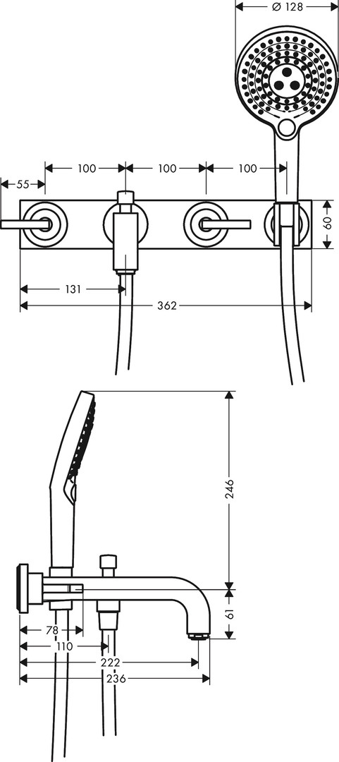 mit Platte, für Wandmontage, bestehend aus 3-Loch-Wannenarmatur, Handbrause, Brausehalter, Brauseschlauch, 2 Verbraucher, Ausladung 222 mm, Anschlussart Grundkörper, Strahlart Armatur Normalstrahl, Strahlart Handbrause Rain, RainAir, WhirlAir, max. Durchflussmenge bei 3 bar 22,5 l/min, Durchfluss für Wanneneinlauf bei 3 bar 22,5 l/min, Durchfluss für Handbrause bei 3 bar 20 l/min, Mindestfließdruck 1 bar, Betriebsdruck min. 1/max. 10 bar, Umsteller mit automatischer Rückstellung, Rückflussverhinderer, Anschlussgröße DN 15, AirPower Technologie, Quick Clean Antikalksystem