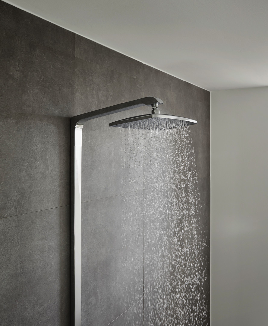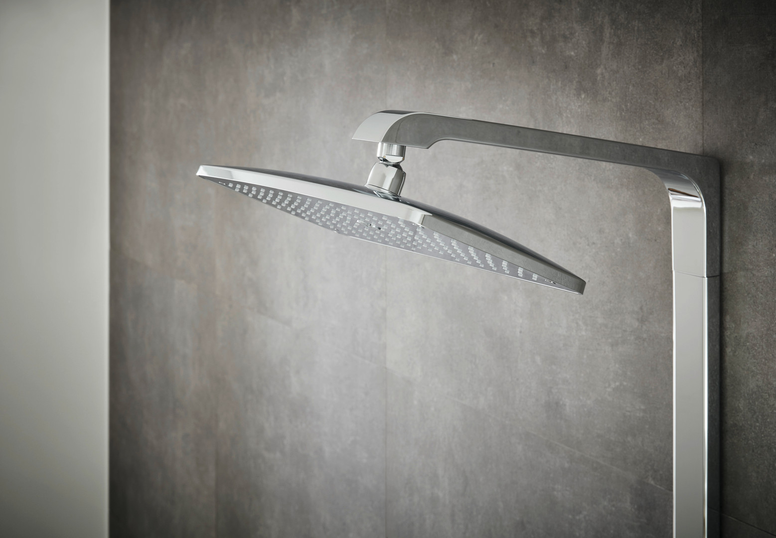Kopfbrause Raindance E 360 Air, Brausekopfgröße 360 x 190 mm, Strahlart Kopfbrause RainAir, Kugelgelenk Kopfbrause im Winkel verstellbar, Ablage aus Sicherheitsglas, Oberfläche Ablage Spiegelglas/Weißglas, Durchflussmenge bei 3 bar 9 l/min, Mindestfließdruck 1 bar, Betriebsdruck min. 1/max. 10 bar, Brausestangenbreite 44 mm, Brausearmlänge Kopfbrause 380 mm, Thermostat Ecostat Select, Sicherheitssperre bei 40 °C, einstellbare Heißwasserbegrenzung, für Durchlauferhitzer geeignet, AP-Installation, Anschlussgröße DN 15, Anschlussgewinde G 1/2, Stichmaß 150 mm +/-12 mm, eigensicher gegen Rückfließen, Gesamtlänge Brausestange 900 mm, bei Montage auf bestehenden G 3/4 Anschlüsse wird der Adapter 02026000 benötigt, Wandmontage, 2 Verbraucher, EcoSmart, AirPower Technologie, Quick Clean Antikalksystem, XXL Performance