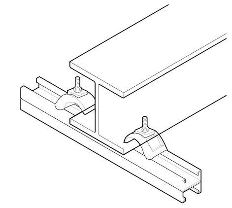 massive Gusseisen-Trägerklammer zur Aufhängung hoher Lasten an Stahlträgern ohne Schweißen und Bohren, bis Flanschstärke 35 mm, Trägerklammer auch gesondert erhältlich, bestehend aus 1x Strut-Schiene 41x21D, 2x Trägerklammer, 4x Schienenendstopfen