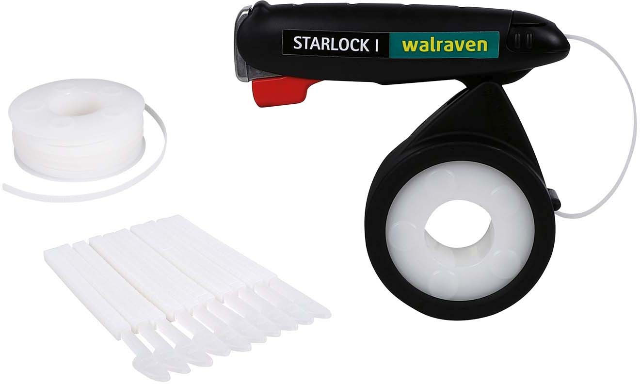Kabelbindersystem zur Anbringung einer großen Zahl an Kabelbindern, zieht das Band an und schneidet den überflüssigen Teil ab, Lieferung als Startset im Blisterpack, Material: Kabelband aus Polyamid, Verschlüsse aus Polyoxymethylen, Kabelbinder Zugfestigkeit 15 kg, Sicherheitsfaktor 1:2, UV-beständig, temperaturbeständig bis ca. 70 °C, Breite 4,5 mm