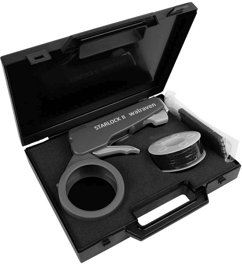 Kabelbindersystem zur Anbringung einer großen Zahl an Kabelbindern, zieht das Band an und schneidet den überflüssigen Teil ab, Ausführung mit Spannhebel, Lieferung Startset im Werkzeugkoffer, Material Kabelband aus Polyamid, Verschlüsse aus Polyoxymethylen, Kabelbinder Zugfestigkeit 15 kg, Sicherheitsfaktor 1:2, UV-beständig, temperaturbeständig bis ca. 70 °C, Breite 4,5 mm