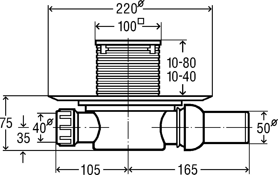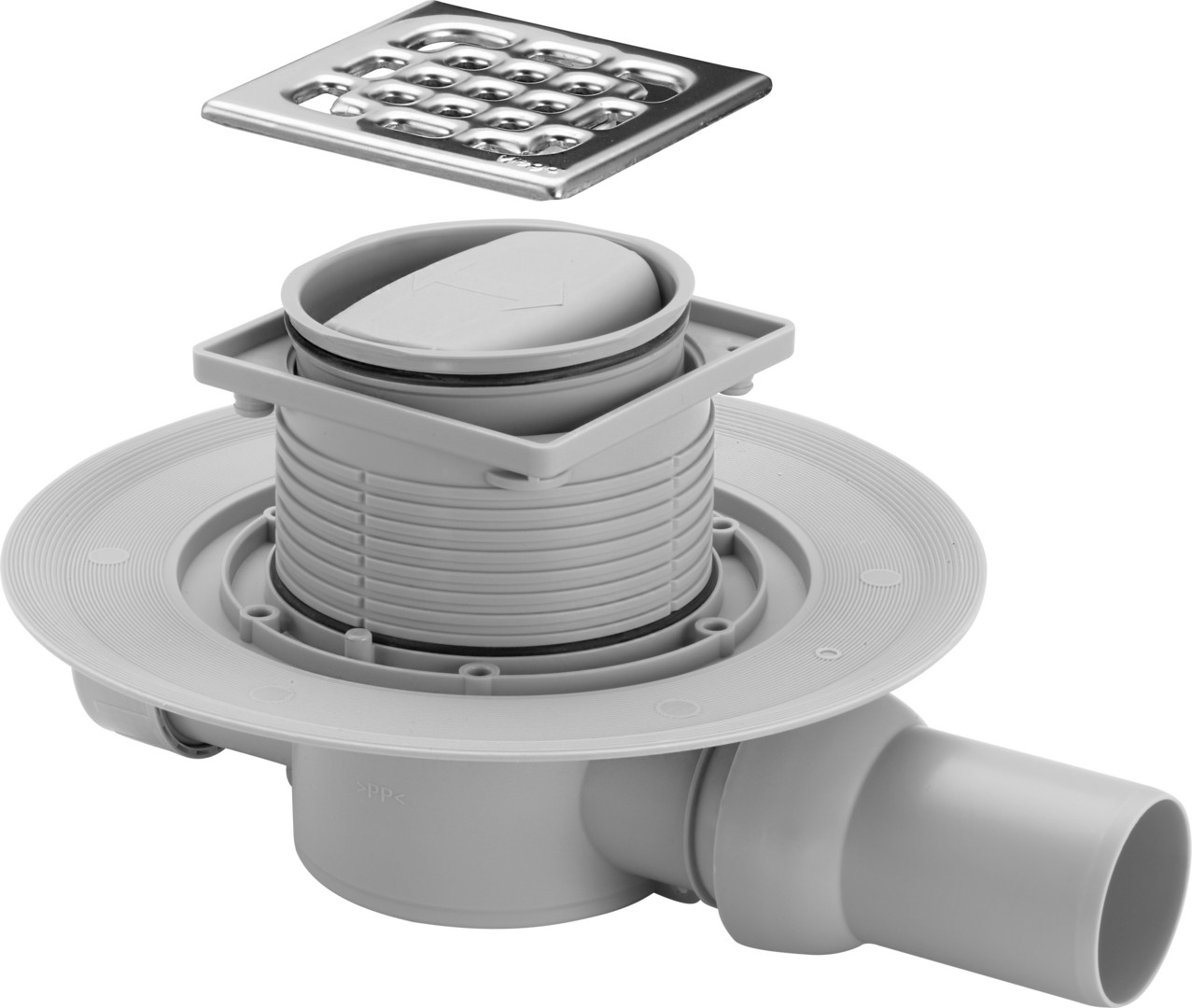 Systemmaß 100, Aufsatz 100 x 100 mm dreh- und höhenverstellbar, Stopfen, Rost Edelstahl 1.4301, Abdichtungsflansch, Geruchverschluss herausnehmbar, Zulauf DN40, Ablaufrohr mit Kugelgelenk, Sperrwasserhöhe 30 mm, Belastungsklasse K=300 kg, Ablaufleistung Anstauhöhe 10 mm 0,33 l/s, Ablaufleistung Anstauhöhe 20 mm 0,4 l/s, Ablaufleistung nach DIN EN 1253