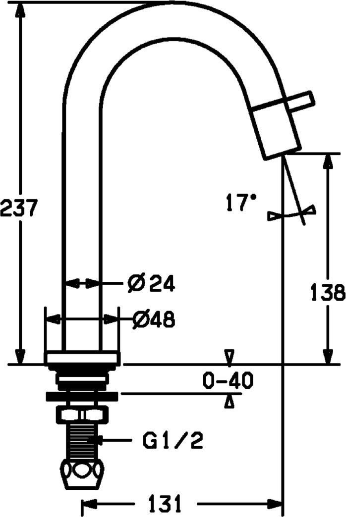 DN 15, Heißwasserversorgung max. 80°C, Arbeitsdruck 0,5-10 bar, Durchfluss bei 3 bar 6 l/min, Anschlussgröße G1/2, Ausladung 131 mm, Sicherungseinrichtung (EN1717) AA, Material Messing, integrierter Strahlregler, ohne Mundstück direkt in den Armaturenauslauf geschraubt, Einhandbedienhebel/Griff, Oberteil mit keramischen Dichtscheiben zur Wassermengeneinstellung für einen Abgang, feststehender Auslauf, Armaturenkörper aus entzinkungsbeständigem Messing (DZR), 1 Zuleitung, für Kalt- oder Mischwasser, ohne Ablaufgarnitur