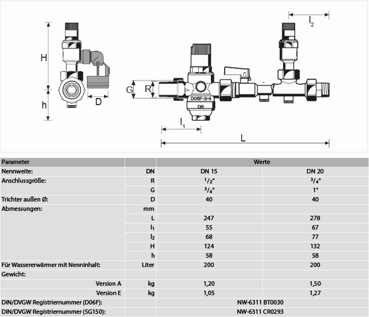 zur Absicherung von druckfesten Warmwasserbereitern nach DIN 4753-1, EN 806-2 und DIN EN 1488, Kompaktarmaturen bei denen alle zur Absicherung geforderten Armaturen wie Rückflussverhinderer/Absperrventil/Prüfstutzen und Membransicherheitsventil und Druckminderer zusammengefasst sind, das Sicherheitsventil schützt den nachgeschalteten Wassererwärmer durch selbsttätiges Öffnen und Schließen, der Rückflussverhinderer verhindert das Rückdrücken, Rückfließen und Rücksaugen von erwärmten Wasser, ein vorgeschalteter Druckminderer mit entlastetem Einsitzventil regelt den Netzwasserdruck auf den erforderlichen Anlagendruck ein, DVGW Zulassung, Medium Trinkwasser, Einbaulauge horizontal oder vertikal, Federhaube aus Kunststoff, max. Mediumstemperatur 40 °C, Druck-Bereich 1,5-6 bar, max. Vordruck 16 bar, Mindestdruckgefälle 1,5 bar, mit Einstellskala, mit Kunststoff-Filtertasse, Sicherheitsgruppe mit Gewindetülle, Rohranschluss Außengewinde