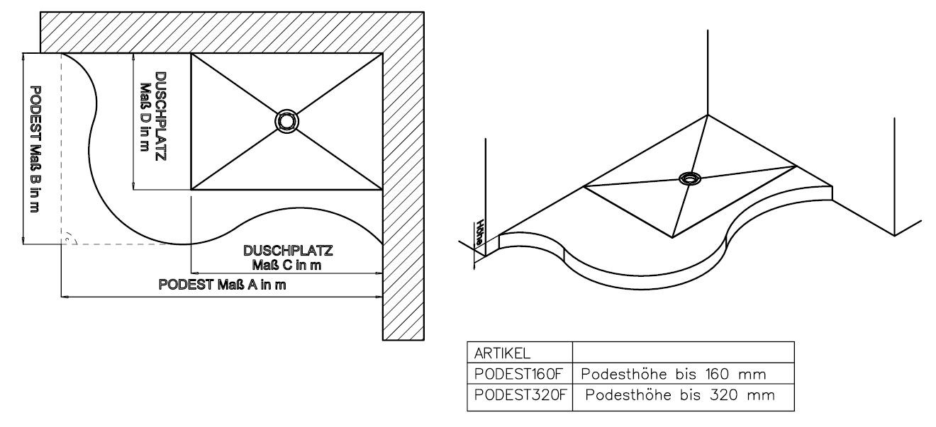 Hartschaum Podest-Element, werkseitig aufgebrachte Grundbeschichtung, bauseitig kürzbar, Fliesengröße > 5 x 5 cm, verfliesungsfertig