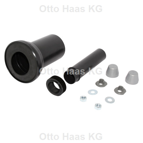 für wandhängende WC´s mit Einlaufstutzen 55 mm Innendurchmesser, Einschubhöhe 135 mm, geprüft nach DIN 1389, Dichtungen aus EPDM alterungs- und witterungsbeständig nach DIN EN 681-1, bestehend aus: Spülrohrverbinder 45 x 185 mm mit Gummilippendichtung, WC-Anschlussstutzen mit Gummistülpdichtung, Abdeckkappen, Exzenterscheiben, Unterlegscheiben, Muttern M 12 und Montageanleitung