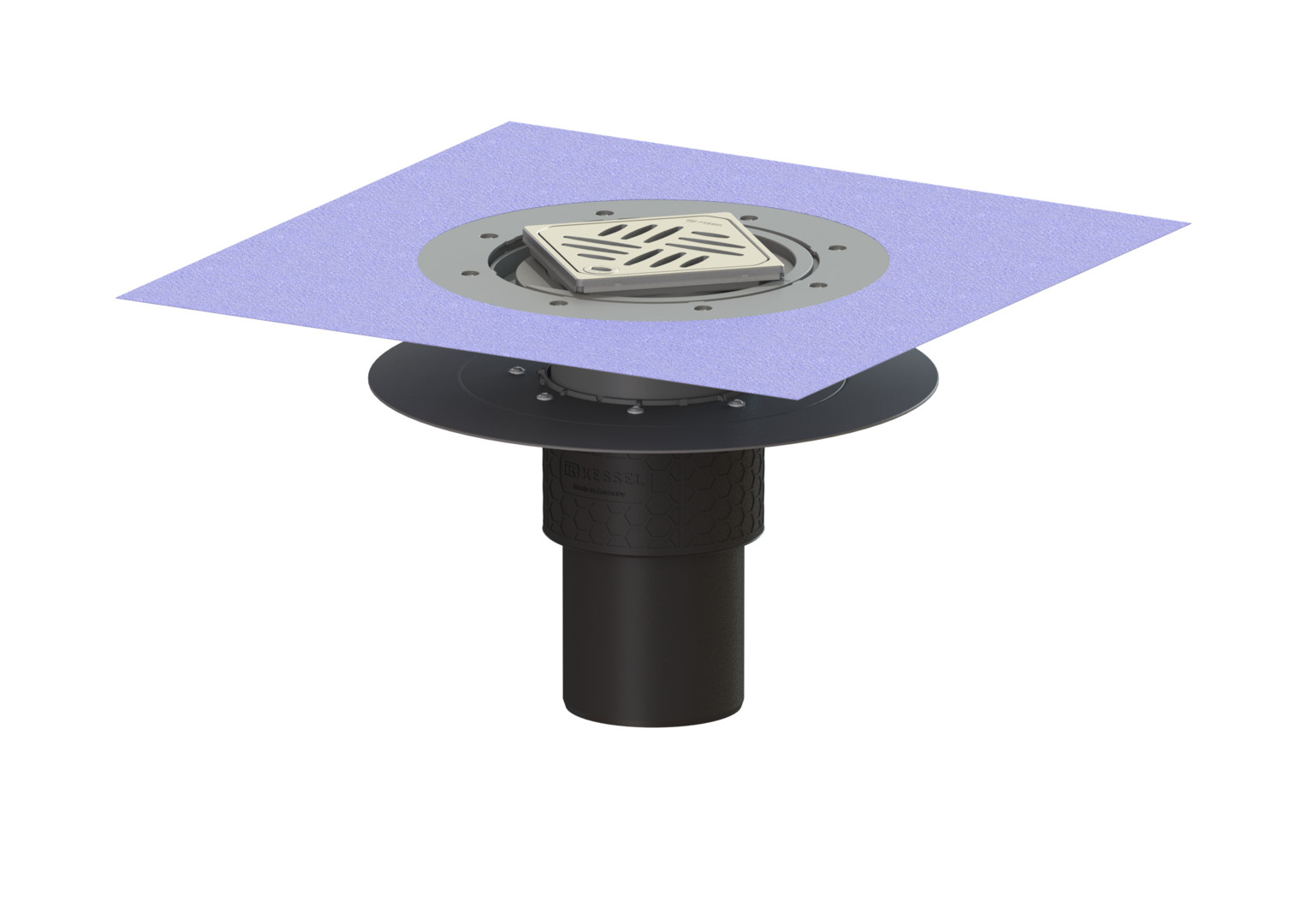 bestehend aus Grundkörper mit Auslauf senkrecht, aus Ecoguss resistant, mit Klebeflansch, Geruchsverschluss, Auslaufstutzen für SML-Rohranschluss, Sperrwasserhöhe 50 mm, Kernlochbohr-Maß 160 mm, Aufsatzstück für Abdichtung im Verbund aus ABS, mit beiliegender Dichtmanschette, Designrost 120 x 120 mm, Rahmen aus Edelstahl V2A, Klasse L 15, Lock und Lift-Verriegelungssystem, Rutschhemmklasse R9 nach DIN 51130, C nach DIN 51097