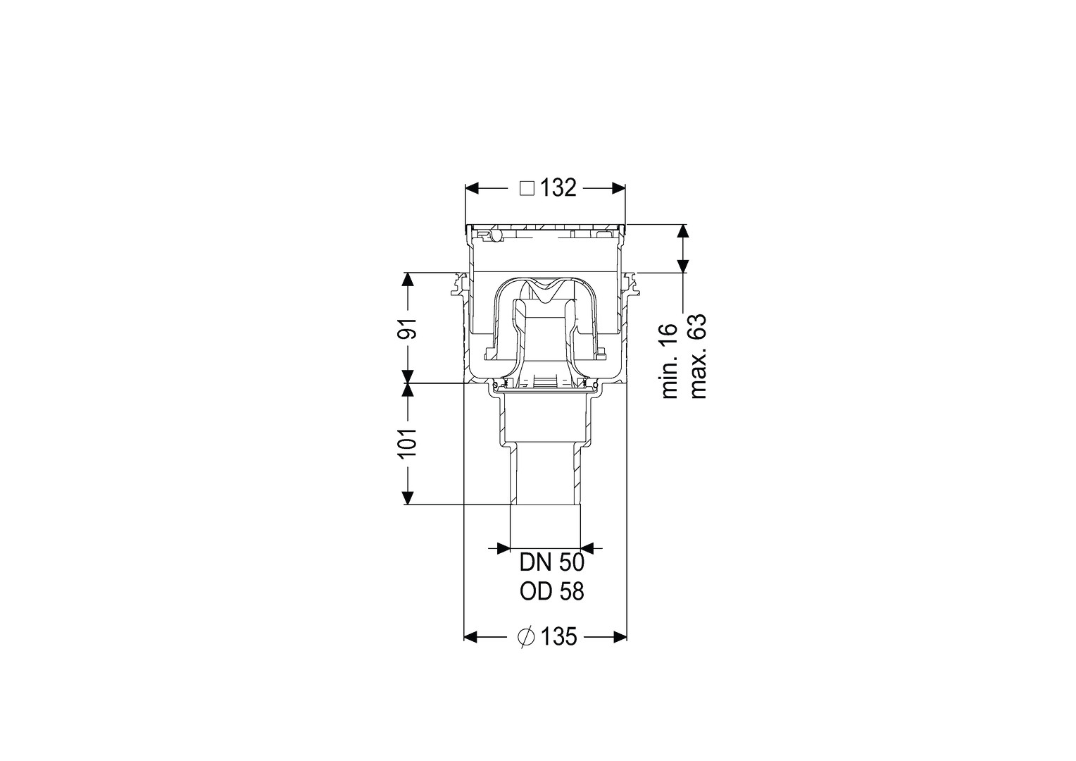 bestehend aus Grundkörper mit Auslauf senkrecht, aus Ecoguss resistant, mit Anschlussrand, Geruchsverschluss, Auslaufstutzen für SML-Rohranschluss, Sperrwasserhöhe 50 mm, Kernlochbohr-Maß 160mm, Aufsatzstück aus ABS, Designrost 120 x 120 mm, Rahmen aus Edelstahl V2A, Klasse L 15, Lock und Lift-Verriegelungssystem, Rutschhemmklasse R9 nach DIN 51130, C nach DIN 51097