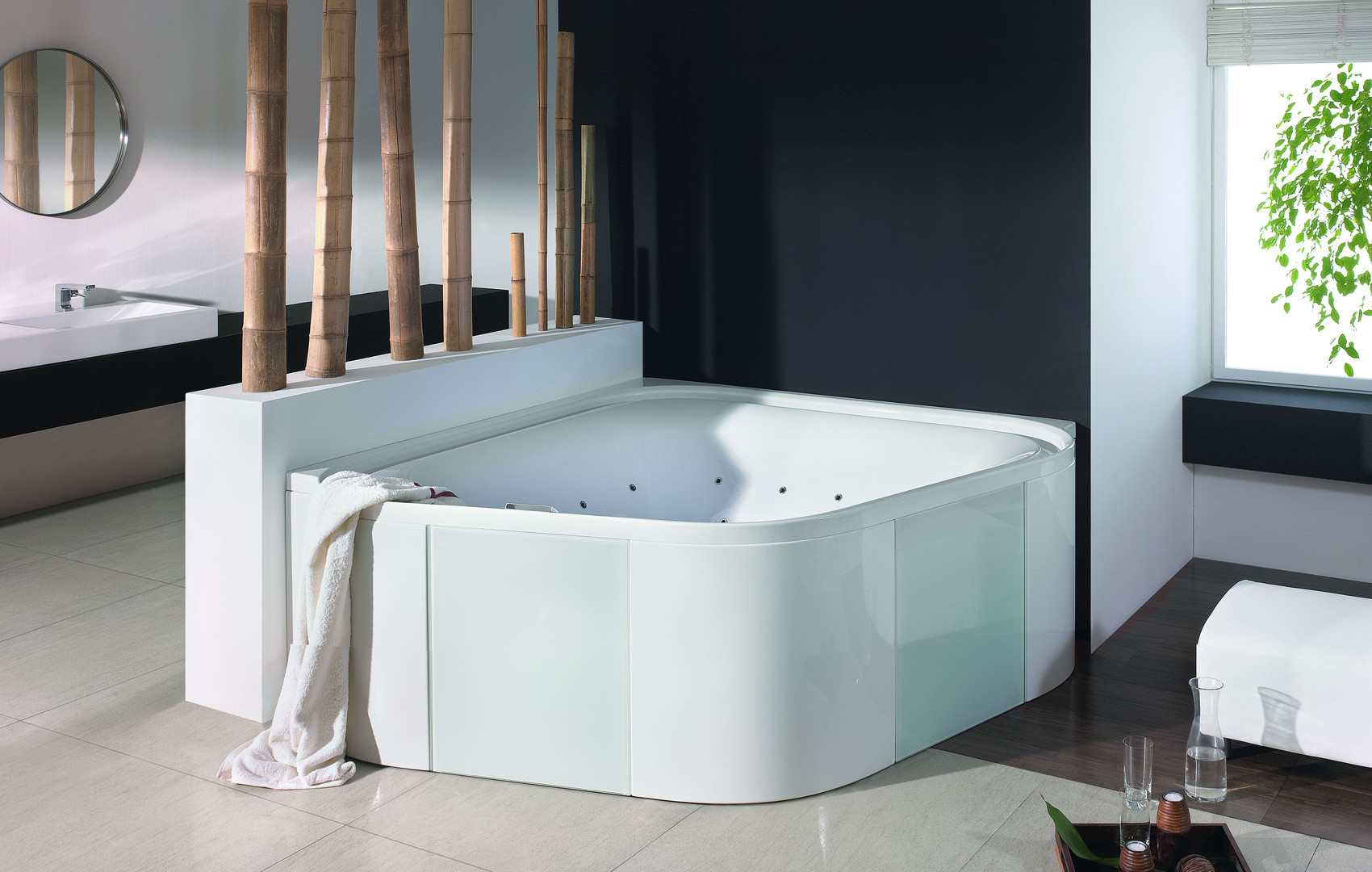 Hoesch Eck-Freisteh-Badewanne Ergo+ 164x164 cm, weiß/verchromt, Wannenverkleidung Glas schwarz