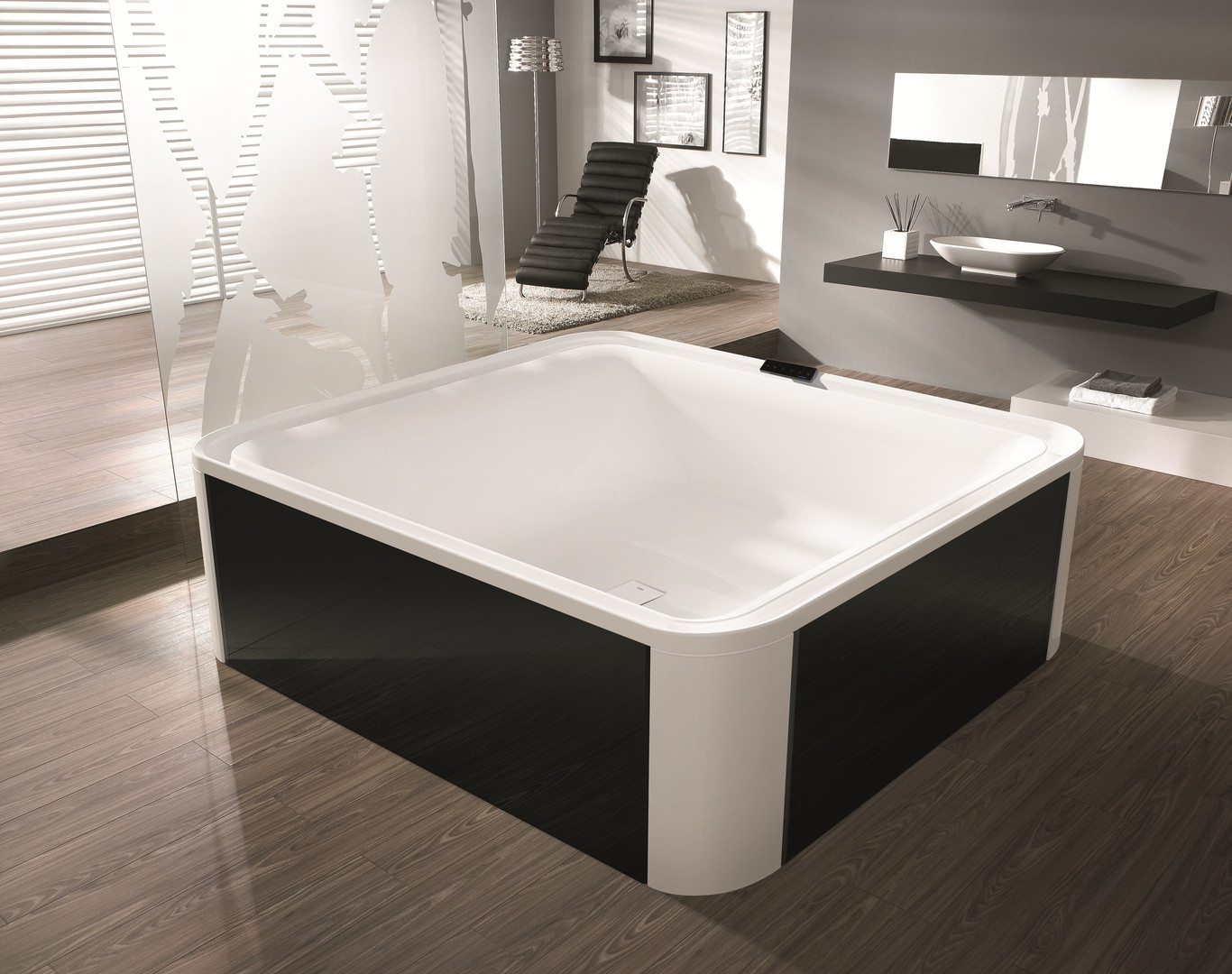 Hoesch Freisteh-Badewanne Ergo+ 207,5x195 cm, weiß/verchromt, Wannenverkleidung Glas schwarz K20728570