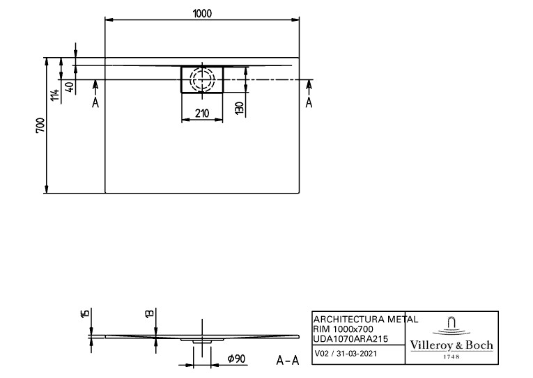V&B Duschwanne Architectura Metalrim Acryl, 90 x 70 x 1,5 cm, weiß K20738933