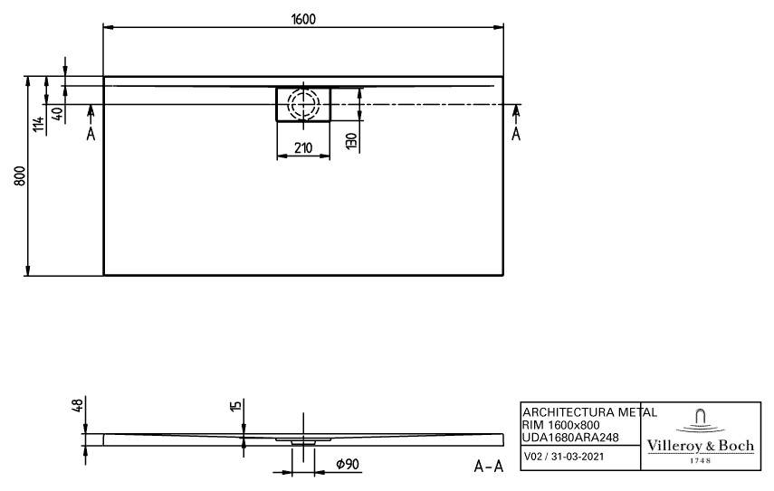 V&B Duschwanne Architectura Metalrim Acryl, 160 x 80 x 4,8 cm, weiß