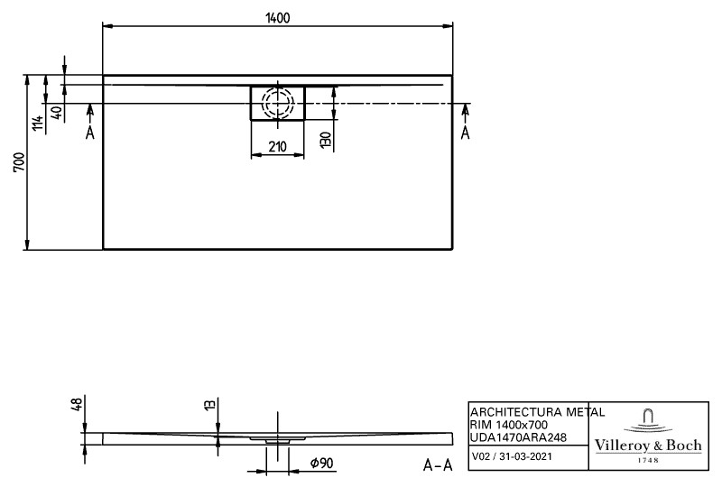 V&B Duschwanne Architectura Metalrim 140 x 70 x 4,8 cm, weiß, Antirutsch, Acryl