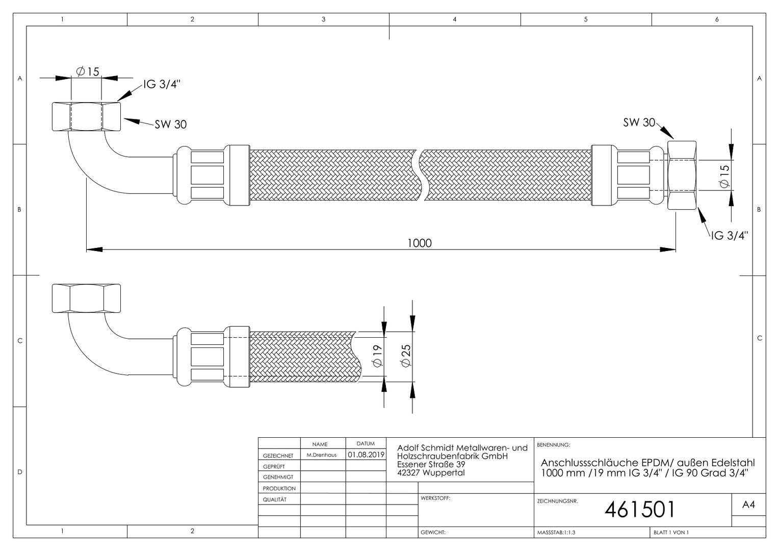 ASW Flex-Anschlussschlauch 1000 mm, 3/4" IG Überwurfwinkelx3/4" IG Überwurfmutter, Innen-d= 19mm