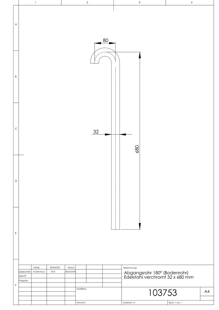 ASW Abgangsrohr 32 x 680 mm, ohne Bördelrand, Edelstahl poliert, 180Grad, Messing verchromt K10804753