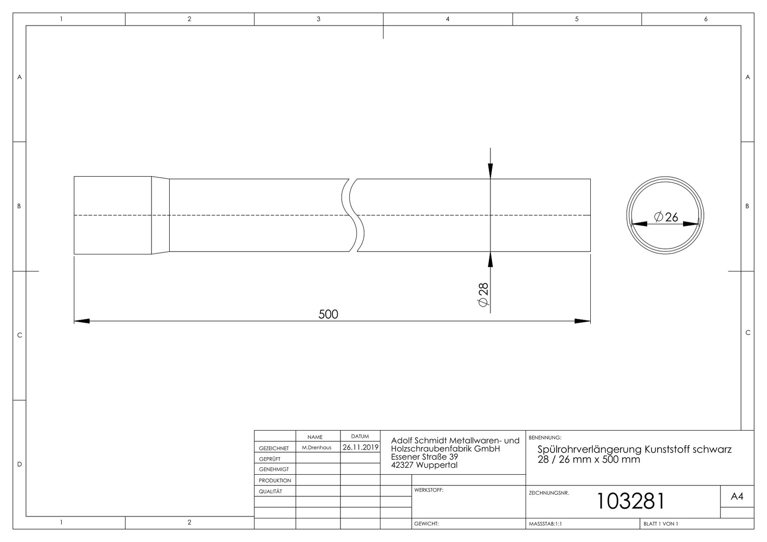 ASW Spülrohrverlängerung 28/26 x 500 mm, Kunststoff schwarz