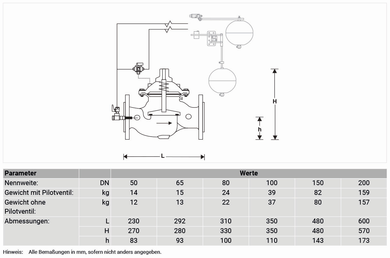 zum Einsatz in industriellen und gewerblichen Anlagen zum Befüllen von Hochbehältern/Behältern und Tanks, Steuerung durch das Eigenmedium über eine Impulsleitung mittels Schwimmerventil, Zertifizierungen DVGW, Medium Trinkwasser, max. Mediumstemperatur 80 °C, stat. Druck PN 16, min. Eingangsdruck 0,7 bar, max. Betriebsdruck 16 bar