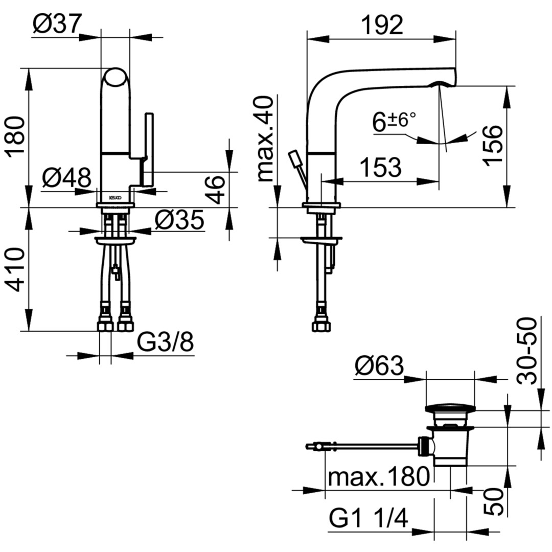 Auslaufhöhe 156 mm, Schwenkwinkel +/-45°, Einlochmontage mit Schnell-Montage-System, Anschlussart Anschlussschläuche G 3/8, Mischwasserkartusche mit keramischen Dichtscheiben, Strahlregler M 24 x 1, Strahlwinkel +/-6° verstellbar, Durchflussmenge begrenzt auf 7,6 l/min, für Durchlauferhitzer geeignet, geräuschgeprüft