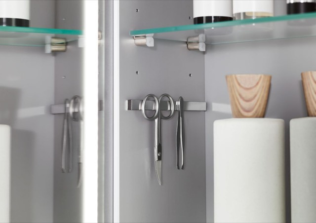 3 Türen, 4 Glasfachböden, 1 Magnetleiste, 1 Vergrößerungsspiegel, Sensorschalter, 2 Steckdosen, mit LED-Beleuchtung