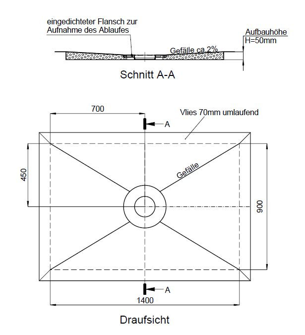 Hartschaum-PLAN-Element mit integriertem Gefälle von ca. 2 %, zur Punktentwässerung für KESSEL-Abläufe reversibel, Ablauf wählbar, werkseits abgedichtet nach DIN 18534-1, Wassereinwirkungsklasse W2-I, bodenbündig, verfliesbar, barrierefrei, Fliesengröße bei Rollstuhlnutzung >= 5 x 5 cm, umlaufend kürzbar, eingedichtete Flanschscheibe zur schraubbaren Montage des Ablaufgehäuses, geringe Aufbauhöhe, abhängig vom eingesetzten Ablauf, verschiedene Ablaufpositionen, hohe Ablaufleistung
