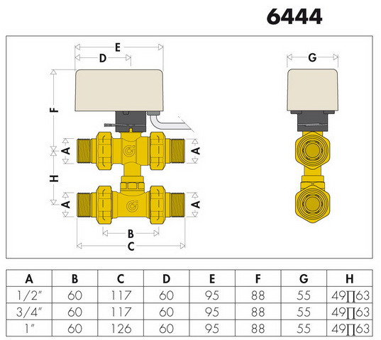 Caleffi Dreiwege-Motor-Zonenkugelventil 6444 1/2", 24 V, mit Bypass-T-Stück