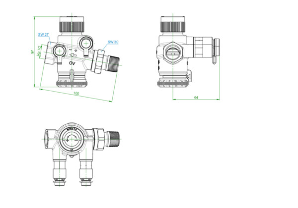 Medium Wasser/Wasser-Glykolgemisch, Betriebstemperatur -10 bis 120 °C, mit Voreinstellung, absperrbar, Gehäusewerkstoff EZB Messing, Anschluss Stellantrieb M 30 x 1,5, Messanschluss