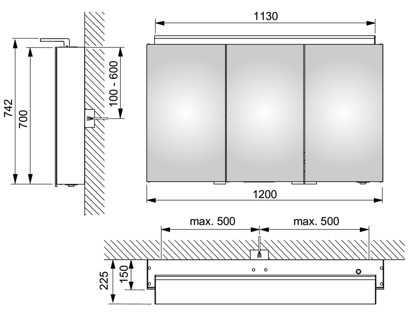 KEUCO Spiegelschrank Royal Lumos 120 x 74,2 x 15 cm, 2 Schubkästen, 26 W, Wandvorbau, 3-türig, silber-eloxiert