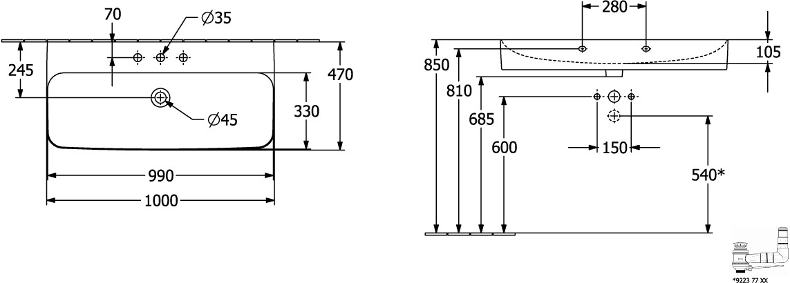 V&B Waschtisch Finion 100x47cm, mittleres Hahnloch durchstochen, ohne Überlauf, pure black C+ K23902513