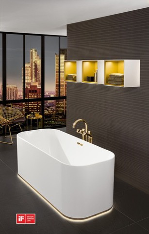 V&B Rechteck-Freistehwanne Finion Ausstattung Gold Quaryl, Push-to-Open-Ventil, Überlauf, Ring, Emotion, weiß