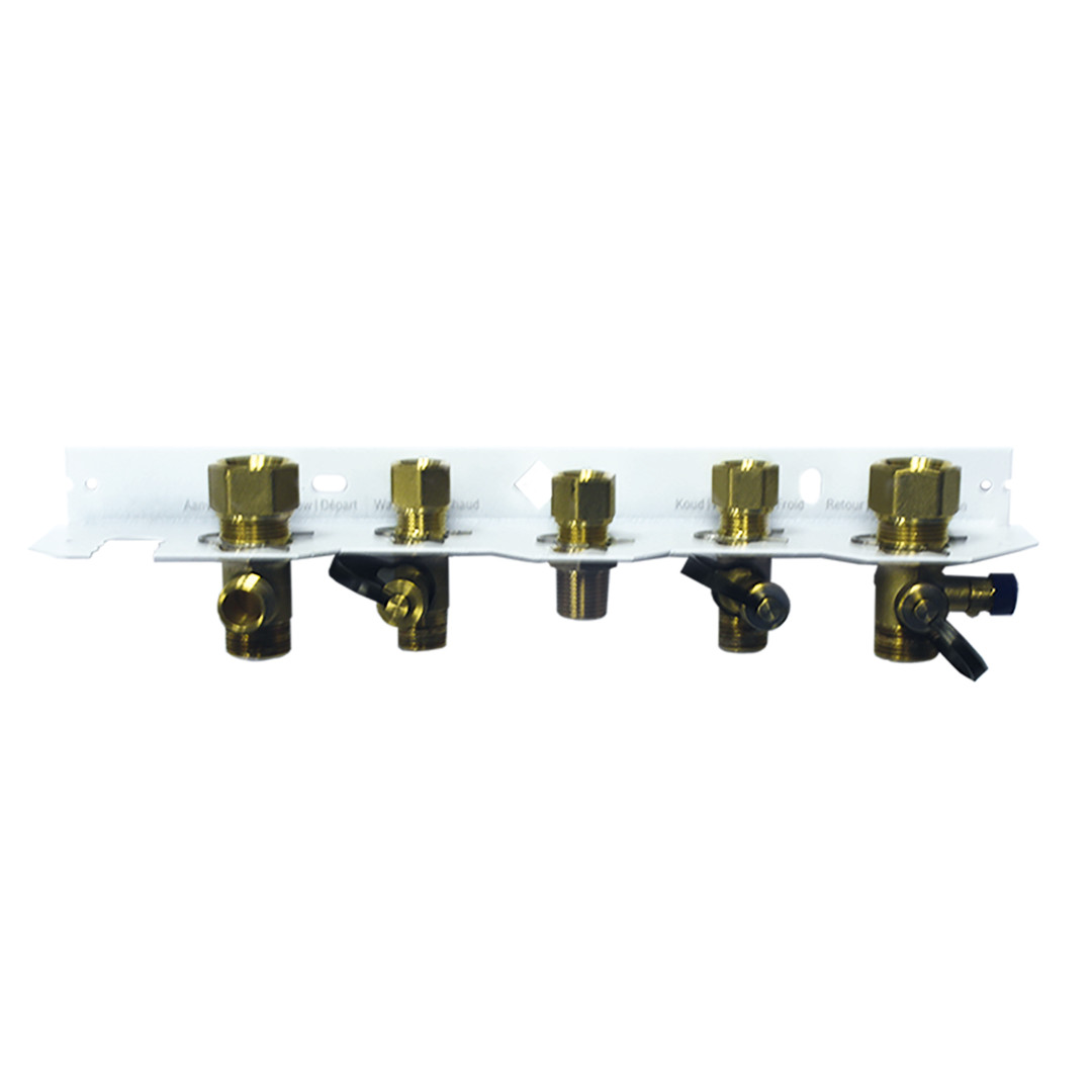 für Hydraulikanschluss, Vorlauffitting DN 20 mit Anschlussstutzen für Sicherheitsventil, Rücklauffitting (DN 20) mit Entleerhahn, Gasfitting, 2x Trinkwasserfitting (DN 15), Sicherheitsventil (3 bar), mit Befestigungsmaterial