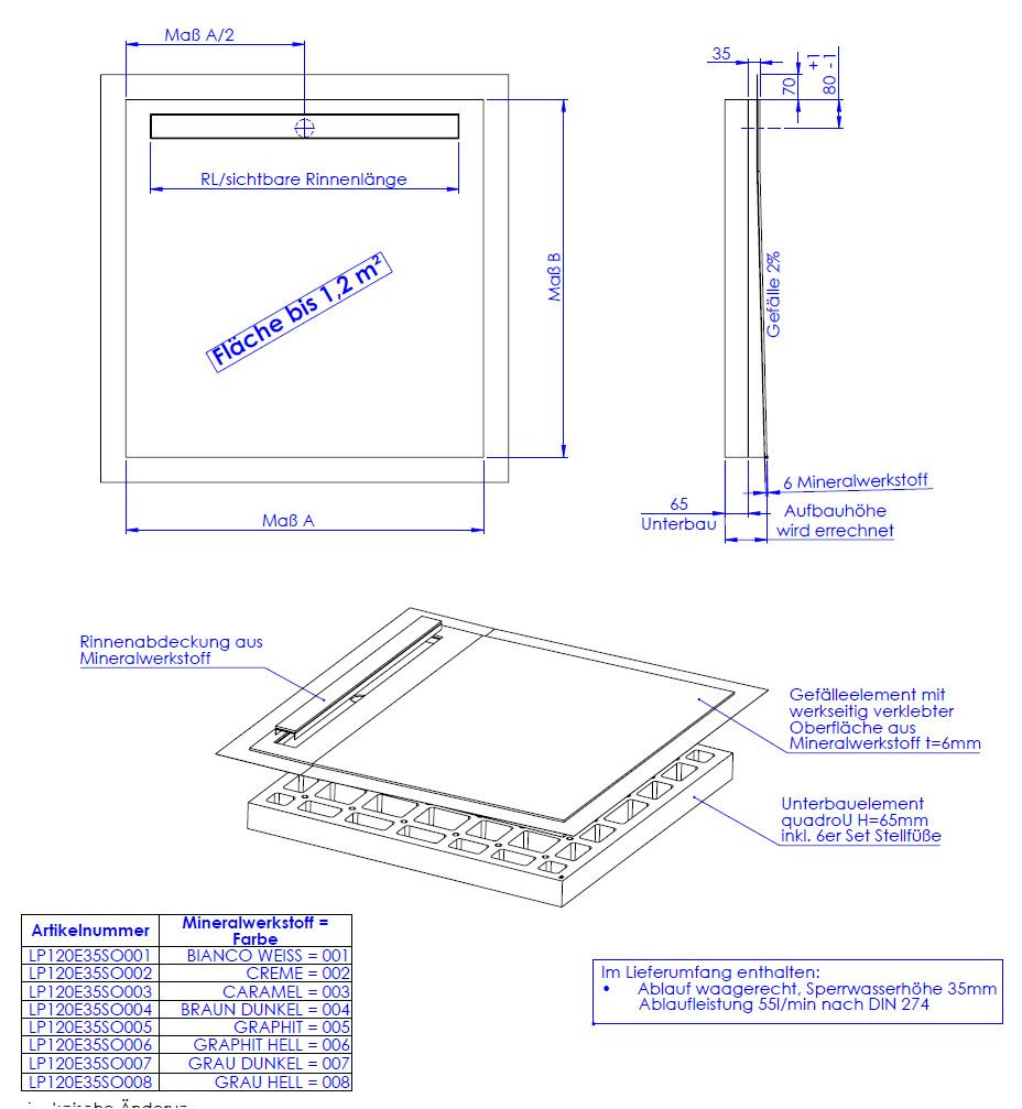 hochwertige Oberfläche aus 0,6 cm Mineralwerkstoff werkseitig aufgebracht auf Hartschaumelement mit eingearbeitetem Gefälle, Oberfläche rutschhemmend nach DIN 51097, Gruppe B, normgerecht abgedichtet nach DIN 18534-1, Wassereinwirkungsklasse W2-1, mit umlaufendem Vliesüberstand von 7 cm zur fachgerechten Abdichtung der Übergänge zur Wand bzw. zu den angrenzenden Bauteilen, integrierte, eingedichtete Rinne mit Bodenablauf, Sperrwasserhöhe 3,5 cm, System mit Unterbauelement quadroU zur Höhenanpassung auf der Baustelle, wahlweise 6,5 oder 8 cm hoch, Unterbau quadroU erweiterbarzum Schallschutz für erhöhte Anforderung, schneidbar, Gefälleelement mit werkseitig verklebter Oberfläche aus Mineralwerkstoff, Rinnenabdeckung aus Mineralwerkstoff, mit 6er Set Stellfüße und Montagekleber, Bodenablauf waagerecht