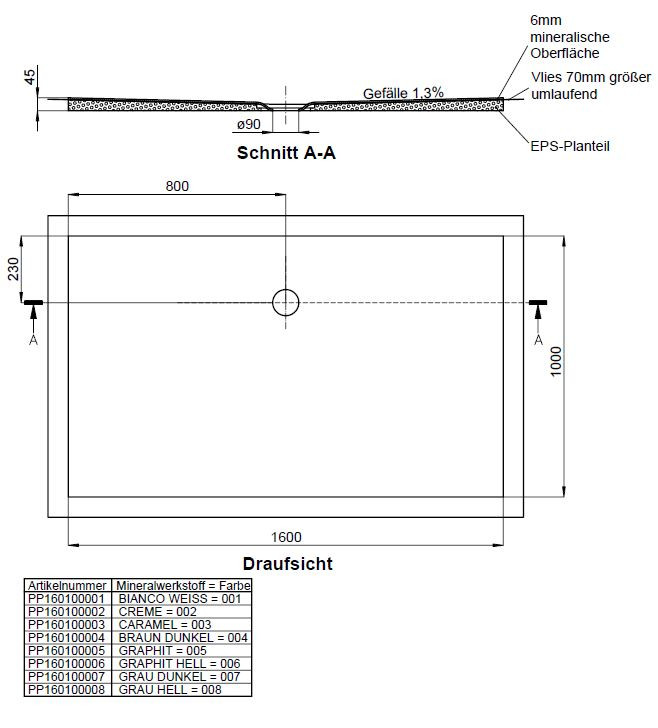 mit Oberfläche aus Mineralwerkstoff 0,6 cm, bodeneben, barrierefrei, rutschhemmend nach DIN 51097, Gruppe B, fugenlose Oberfläche, werkseitig aufgebracht auf Hartschaumelement, mit integriertem Gefälle, werkseitig aufgebrachte Vliesabdichtung mit Überstand 7 cm umlaufend gem. DIN 18534-1, Wassereinwirkungsklasse W2-I, passend für alle Abläufe 9 cm