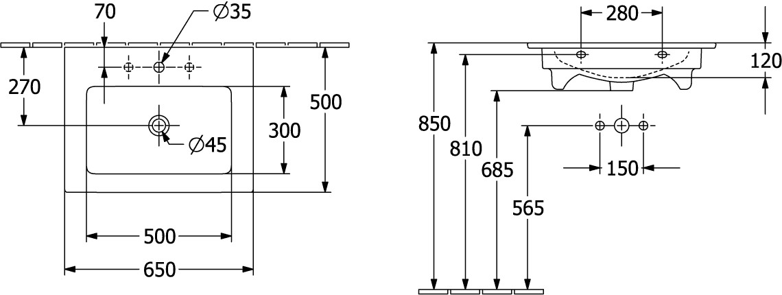 V&B Waschtisch Venticello 65x50cm, mit Hahnloch, mit Überlauf, weiß 177924