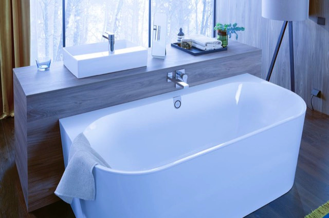 Vorwand-Badewanne, Inhalt mit 1 Person 205 l, 1 x verlängerter Ab- und Überlauf (verchromt und White), Durchmesser Ø 52 mm