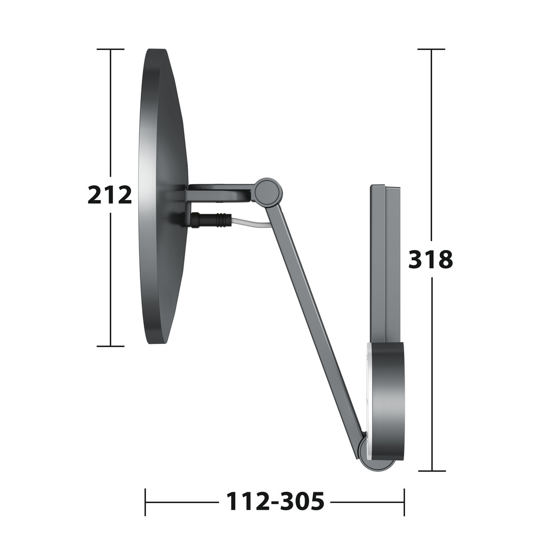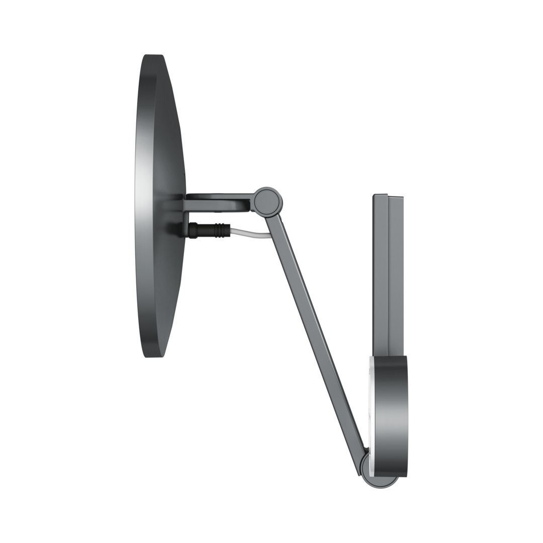 Wandmodell, eckig, IP24, stufenlos einstellbar von 2700 Kelvin (warmweiß) bis 6500 Kelvin (Tageslicht), mit UP-Kabelführung, an dreidimensional verstellbarem Schwenkarm, Spiegel einseitig, Vergrößerungsfaktor x 5, Bedienung über Glasbedienfeld mit kapazitiver Touch-Sensorik und LED-Anzeige, Stromversorgung: Netzanschluss über Wandanschlussdose, 12 V Unterputz-Netzteil, Eingangsbereich 220~240 V, Unterputz-Netzteil und Niedervolt-Verbindungskabel im Lieferumfang enthalten, Beleuchtung: LED 4,5 Watt