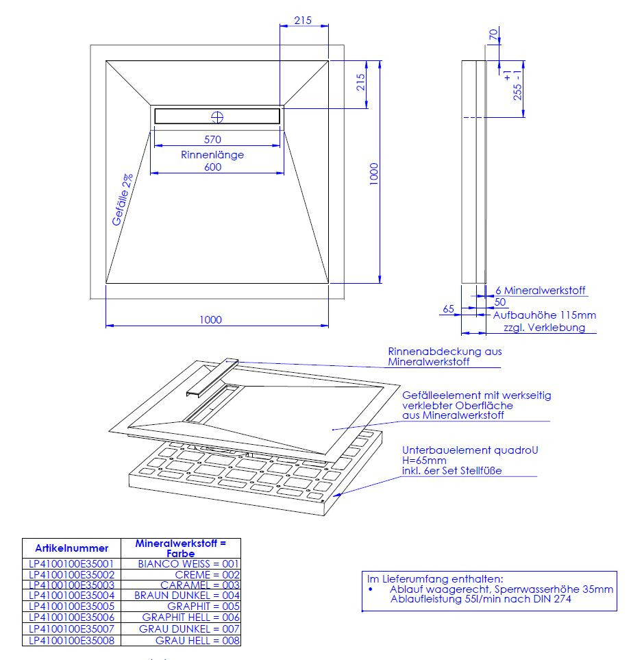 hochwertige Oberfläche aus 0,6 cm Mineralwerkstoff werkseitig aufgebracht auf Hartschaumelement mit eingearbeitetem Gefälle, Oberfläche rutschhemmend nach DIN 51097, Gruppe B, normgerecht abgedichtet nach DIN 18534-1, Wassereinwirkungsklasse W2-1, mit umlaufendem Vliesüberstand von 7 cm zur fachgerechten Abdichtung der Übergänge zur Wand bzw. zu den angrenzenden Bauteilen, integrierte, eingedichtete Rinne mit Bodenablauf, Sperrwasserhöhe 3,5 cm, System mit Unterbauelement quadroU zur Höhenanpassung auf der Baustelle, wahlweise 6,5 oder 8 cm hoch, Unterbau quadroU erweiterbarzum Schallschutz für erhöhte Anforderung, schneidbar, Gefälleelement mit werkseitig verklebter Oberfläche aus Mineralwerkstoff, Rinnenabdeckung aus Mineralwerkstoff, mit 6er Set Stellfüße und Montagekleber, Bodenablauf waagerecht