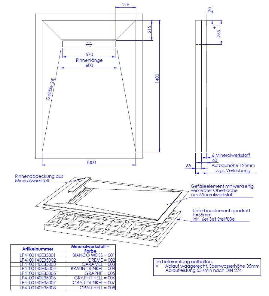 hochwertige Oberfläche aus 0,6 cm Mineralwerkstoff werkseitig aufgebracht auf Hartschaumelement mit eingearbeitetem Gefälle, Oberfläche rutschhemmend nach DIN 51097, Gruppe B, normgerecht abgedichtet nach DIN 18534-1, Wassereinwirkungsklasse W2-1, mit umlaufendem Vliesüberstand von 7 cm zur fachgerechten Abdichtung der Übergänge zur Wand bzw. zu den angrenzenden Bauteilen, integrierte, eingedichtete Rinne mit Bodenablauf, Sperrwasserhöhe 3,5 cm, System mit Unterbauelement quadroU zur Höhenanpassung auf der Baustelle, wahlweise 6,5 oder 8 cm hoch, Unterbau quadroU erweiterbarzum Schallschutz für erhöhte Anforderung, schneidbar, Gefälleelement mit werkseitig verklebter Oberfläche aus Mineralwerkstoff, Rinnenabdeckung aus Mineralwerkstoff, mit 6er Set Stellfüße und Montagekleber, Bodenablauf waagerecht