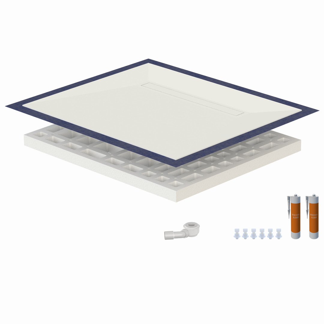 hochwertige Oberfläche aus 0,6 cm Mineralwerkstoff werkseitig aufgebracht auf Hartschaumelement mit eingearbeitetem Gefälle, Oberfläche rutschhemmend nach DIN 51097, Gruppe B, normgerecht abgedichtet nach DIN 18534-1, Wassereinwirkungsklasse W2-1, mit umlaufendem Vliesüberstand von 7 cm zur fachgerechten Abdichtung der Übergänge zur Wand bzw. zu den angrenzenden Bauteilen, integrierte, eingedichtete Rinne mit Bodenablauf, Sperrwasserhöhe 3,5 cm, System mit Unterbauelement quadroU zur Höhenanpassung auf der Baustelle, wahlweise 6,5 oder 8 cm hoch, Unterbau quadroU erweiterbarzum Schallschutz für erhöhte Anforderung, schneidbar, Gefälleelement mit werkseitig verklebter Oberfläche aus Mineralwerkstoff, Rinnenabdeckung aus Mineralwerkstoff, mit 6er Set Stellfüße und Montagekleber, Bodenablauf waagerecht
