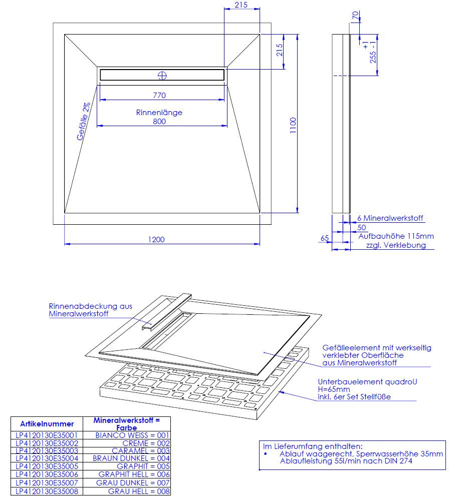 hochwertige Oberfläche aus 0,6 cm Mineralwerkstoff werkseitig aufgebracht auf Hartschaumelement mit eingearbeitetem Gefälle, Oberfläche rutschhemmend nach DIN 51097, Gruppe B, normgerecht abgedichtet nach DIN 18534-1, Wassereinwirkungsklasse W2-1, mit umlaufendem Vliesüberstand von 7 cm zur fachgerechten Abdichtung der Übergänge zur Wand bzw. zu den angrenzenden Bauteilen, integrierte, eingedichtete Rinne mit Bodenablauf, Sperrwasserhöhe 3,5 cm, System mit Unterbauelement quadroU zur Höhenanpassung auf der Baustelle, wahlweise 6,5 oder 8 cm hoch, Unterbau quadroU erweiterbarzum Schallschutz für erhöhte Anforderung, schneidbar, Gefälleelement mit werkseitig verklebter Oberfläche aus Mineralwerkstoff, Rinnenabdeckung aus Mineralwerkstoff, mit 6er Set Stellfüße und Montagekleber, Bodenablauf waagerecht