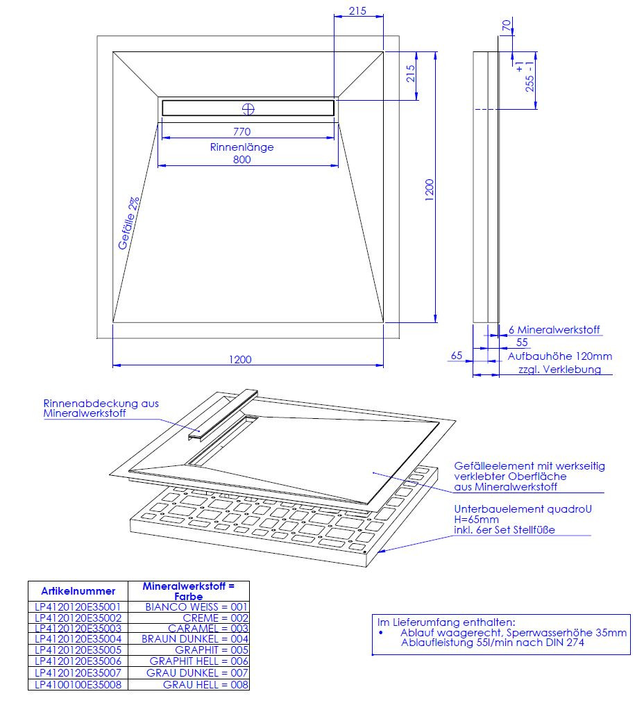 hochwertige Oberfläche aus 0,6 cm Mineralwerkstoff werkseitig aufgebracht auf Hartschaumelement mit eingearbeitetem Gefälle, Oberfläche rutschhemmend nach DIN 51097, Gruppe B, normgerecht abgedichtet nach DIN 18534-1, Wassereinwirkungsklasse W2-1, mit umlaufendem Vliesüberstand von 7 cm zur fachgerechten Abdichtung der Übergänge zur Wand bzw. zu den angrenzenden Bauteilen, integrierte, eingedichtete Rinne mit Bodenablauf, Sperrwasserhöhe 3,5 cm, System mit Unterbauelement quadroU zur Höhenanpassung auf der Baustelle, wahlweise 6,5 oder 8 cm hoch, Unterbau quadroU erweiterbarzum Schallschutz für erhöhte Anforderung, schneidbar, Gefälleelement mit werkseitig verklebter Oberfläche aus Mineralwerkstoff, Rinnenabdeckung aus Mineralwerkstoff, mit 6er Set Stellfüße und Montagekleber, Bodenablauf waagerecht