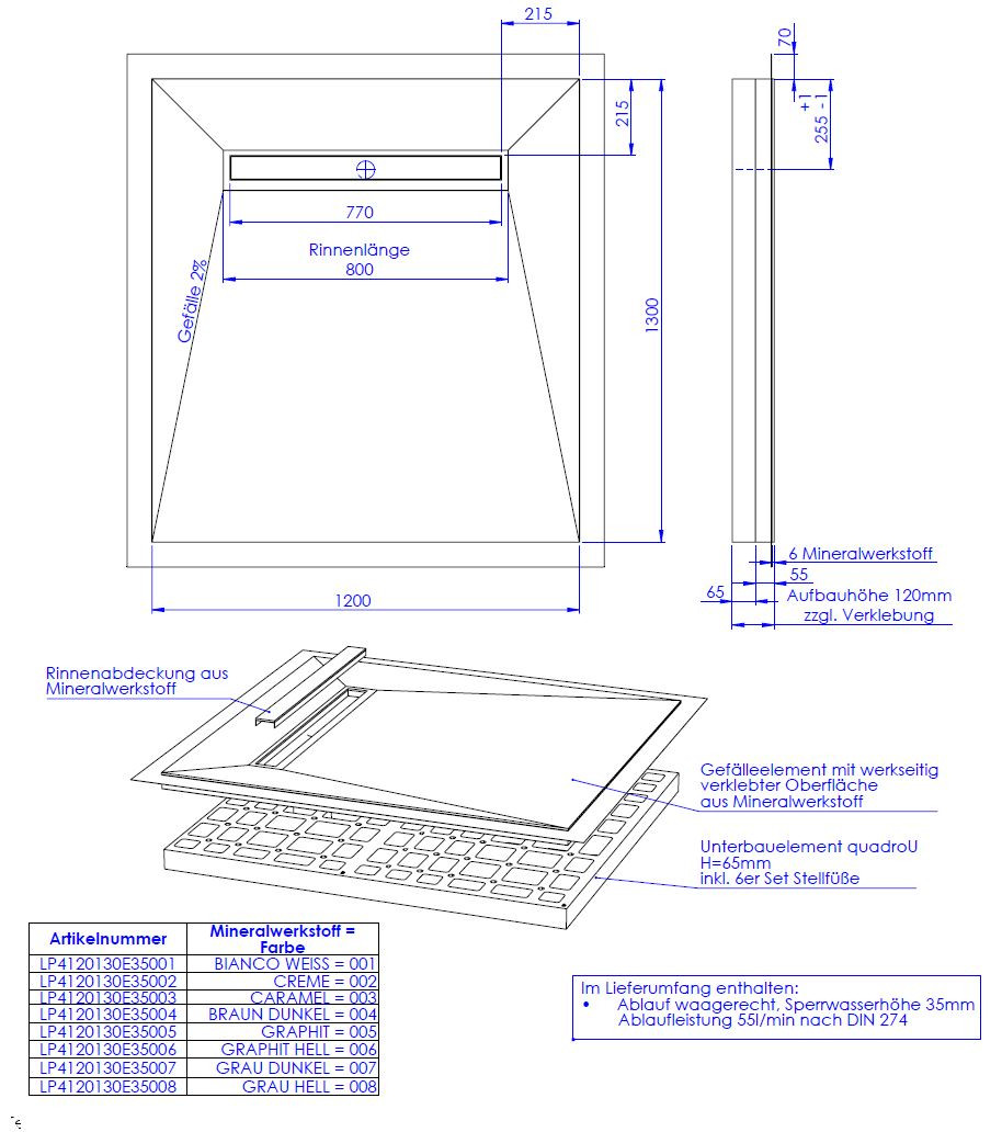 hochwertige Oberfläche aus 0,6 cm Mineralwerkstoff werkseitig aufgebracht auf Hartschaumelement mit eingearbeitetem Gefälle, Oberfläche rutschhemmend nach DIN 51097, Gruppe B, normgerecht abgedichtet nach DIN 18534-1, Wassereinwirkungsklasse W2-1, mit umlaufendem Vliesüberstand von 7 cm zur fachgerechten Abdichtung der Übergänge zur Wand bzw. zu den angrenzenden Bauteilen, integrierte, eingedichtete Rinne mit Bodenablauf, Sperrwasserhöhe 3,5 cm, System mit Unterbauelement quadroU zur Höhenanpassung auf der Baustelle, wahlweise 6,5 oder 8 cm hoch, Unterbau quadroU erweiterbarzum Schallschutz für erhöhte Anforderung, schneidbar, Gefälleelement mit werkseitig verklebter Oberfläche aus Mineralwerkstoff, Rinnenabdeckung aus Mineralwerkstoff, mit 6er Set Stellfüße und Montagekleber, Bodenablauf waagerecht