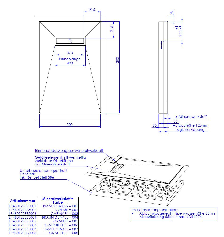 hochwertige Oberfläche aus 0,6 cm Mineralwerkstoff werkseitig aufgebracht auf Hartschaumelement mit eingearbeitetem Gefälle, Oberfläche rutschhemmend nach DIN 51097, Gruppe B, normgerecht abgedichtet nach DIN 18534-1, Wassereinwirkungsklasse W2-1, mit umlaufendem Vliesüberstand von 7 cm zur fachgerechten Abdichtung der Übergänge zur Wand bzw. zu den angrenzenden Bauteilen, integrierte, eingedichtete Rinne mit Bodenablauf, Sperrwasserhöhe 3,5 cm, System mit Unterbauelement quadroU zur Höhenanpassung auf der Baustelle, wahlweise 6,5 oder 8 cm hoch, Unterbau quadroU erweiterbarzum Schallschutz für erhöhte Anforderung, schneidbar, Gefälleelement mit werkseitig verklebter Oberfläche aus Mineralwerkstoff, Rinnenabdeckung aus Mineralwerkstoff, mit 6er Set Stellfüße und Montagekleber, Bodenablauf waagerecht