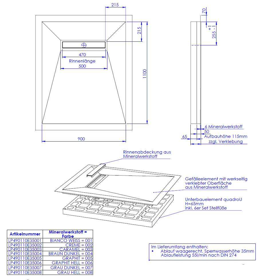 hochwertige Oberfläche aus 0,6 cm Mineralwerkstoff werkseitig aufgebracht auf Hartschaumelement mit eingearbeitetem Gefälle, Oberfläche rutschhemmend nach DIN 51097, Gruppe B, normgerecht abgedichtet nach DIN 18534-1, Wassereinwirkungsklasse W2-1, mit umlaufendem Vliesüberstand von 7 cm zur fachgerechten Abdichtung der Übergänge zur Wand bzw. zu den angrenzenden Bauteilen, integrierte, eingedichtete Rinne mit Bodenablauf, Sperrwasserhöhe 3,5 cm, System mit Unterbauelement quadroU zur Höhenanpassung auf der Baustelle, wahlweise 6,5 oder 8 cm hoch, Unterbau quadroU erweiterbarzum Schallschutz für erhöhte Anforderung, schneidbar, Gefälleelement mit werkseitig verklebter Oberfläche aus Mineralwerkstoff, Rinnenabdeckung aus Mineralwerkstoff, mit 6er Set Stellfüße und Montagekleber, Bodenablauf waagerecht