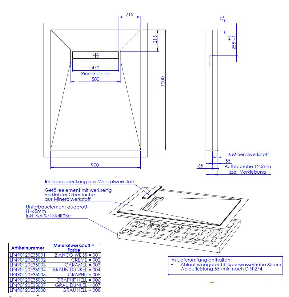 hochwertige Oberfläche aus 0,6 cm Mineralwerkstoff werkseitig aufgebracht auf Hartschaumelement mit eingearbeitetem Gefälle, Oberfläche rutschhemmend nach DIN 51097, Gruppe B, normgerecht abgedichtet nach DIN 18534-1, Wassereinwirkungsklasse W2-1, mit umlaufendem Vliesüberstand von 7 cm zur fachgerechten Abdichtung der Übergänge zur Wand bzw. zu den angrenzenden Bauteilen, integrierte, eingedichtete Rinne mit Bodenablauf, Sperrwasserhöhe 3,5 cm, System mit Unterbauelement quadroU zur Höhenanpassung auf der Baustelle, wahlweise 6,5 oder 8 cm hoch, Unterbau quadroU erweiterbarzum Schallschutz für erhöhte Anforderung, schneidbar, Gefälleelement mit werkseitig verklebter Oberfläche aus Mineralwerkstoff, Rinnenabdeckung aus Mineralwerkstoff, mit 6er Set Stellfüße und Montagekleber, Bodenablauf waagerecht