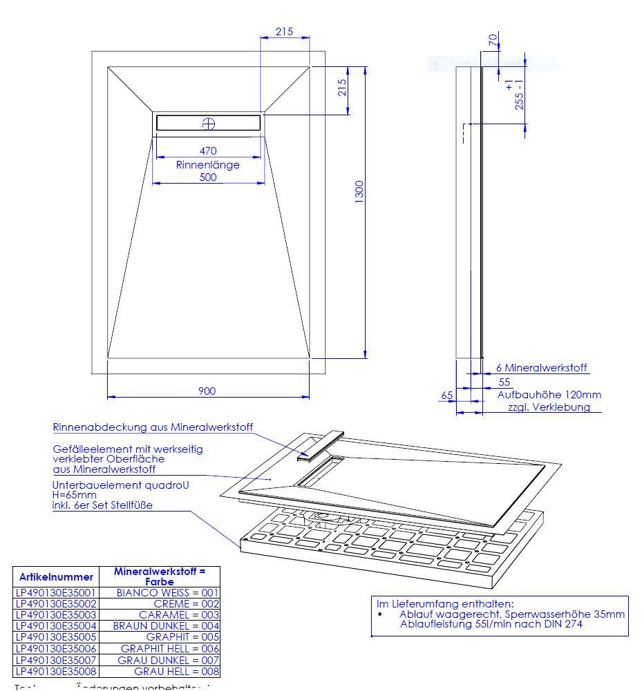 hochwertige Oberfläche aus 0,6 cm Mineralwerkstoff werkseitig aufgebracht auf Hartschaumelement mit eingearbeitetem Gefälle, Oberfläche rutschhemmend nach DIN 51097, Gruppe B, normgerecht abgedichtet nach DIN 18534-1, Wassereinwirkungsklasse W2-1, mit umlaufendem Vliesüberstand von 7 cm zur fachgerechten Abdichtung der Übergänge zur Wand bzw. zu den angrenzenden Bauteilen, integrierte, eingedichtete Rinne mit Bodenablauf, Sperrwasserhöhe 3,5 cm, System mit Unterbauelement quadroU zur Höhenanpassung auf der Baustelle, wahlweise 6,5 oder 8 cm hoch, Unterbau quadroU erweiterbarzum Schallschutz für erhöhte Anforderung, schneidbar, Gefälleelement mit werkseitig verklebter Oberfläche aus Mineralwerkstoff, Rinnenabdeckung aus Mineralwerkstoff, mit 6er Set Stellfüße und Montagekleber, Bodenablauf waagerecht