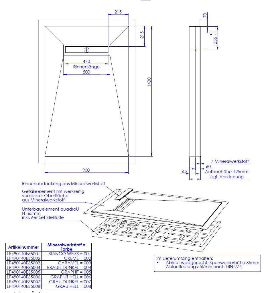 hochwertige Oberfläche aus 0,6 cm Mineralwerkstoff werkseitig aufgebracht auf Hartschaumelement mit eingearbeitetem Gefälle, Oberfläche rutschhemmend nach DIN 51097, Gruppe B, normgerecht abgedichtet nach DIN 18534-1, Wassereinwirkungsklasse W2-1, mit umlaufendem Vliesüberstand von 7 cm zur fachgerechten Abdichtung der Übergänge zur Wand bzw. zu den angrenzenden Bauteilen, integrierte, eingedichtete Rinne mit Bodenablauf, Sperrwasserhöhe 3,5 cm, System mit Unterbauelement quadroU zur Höhenanpassung auf der Baustelle, wahlweise 6,5 oder 8 cm hoch, Unterbau quadroU erweiterbarzum Schallschutz für erhöhte Anforderung, schneidbar, Gefälleelement mit werkseitig verklebter Oberfläche aus Mineralwerkstoff, Rinnenabdeckung aus Mineralwerkstoff, mit 6er Set Stellfüße und Montagekleber, Bodenablauf waagerecht
